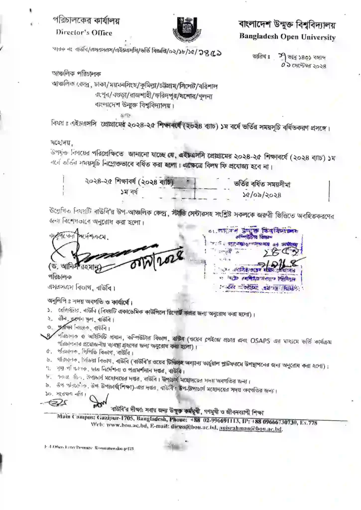বাংলাদেশ উন্মুক্ত বিশ্ববিদ্যালয়ে এইচএসসি প্রোগ্রামের ২০২৪-২৫ শিক্ষাবর্ষে ভর্তির সময়সূচি বর্ধিতকরণ