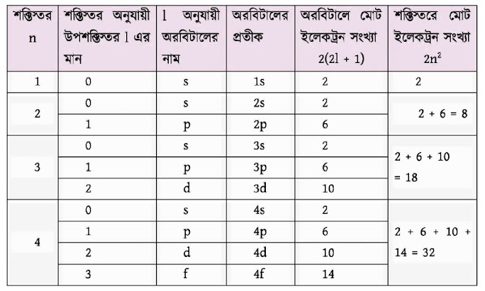 দেখা যাচ্ছে, s উপশক্তিস্তরে সর্বোচ্চ 2 টি ইলেকট্রন, p উপশক্তিস্তরে সর্বোচ্চ 6 টি ইলেকট্রন, d উপশক্তিস্তরে সর্বোচ্চ 10 টি ইলেকট্রন এবং f উপশক্তিস্তরে সর্বোচ্চ 14 টি ইলেকট্রন থাকতে পারে।